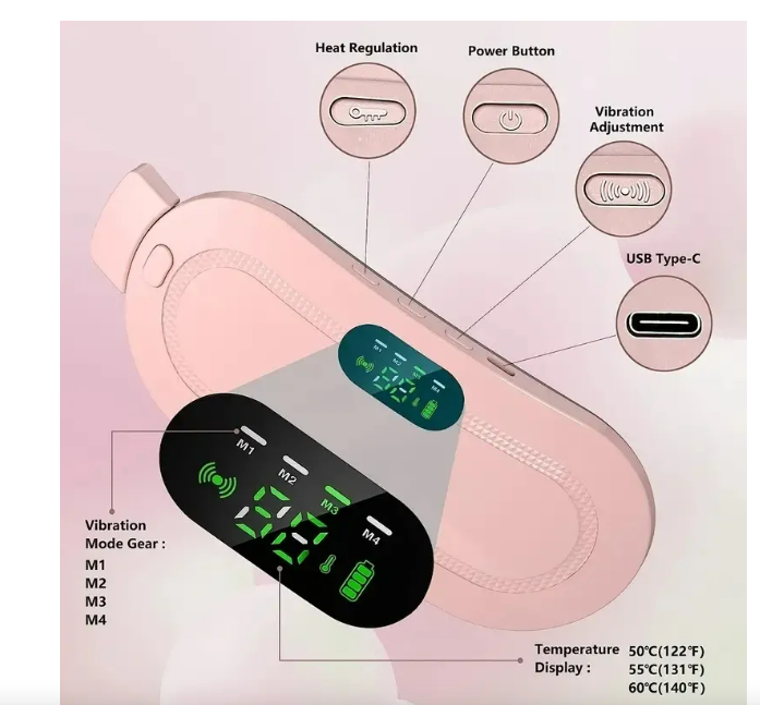 CINTURÓN ALMOHADILLA DE CALOR PARA ALIVIAR CÓLICOS MENSTRUALES Con este almohadilla de calor ajustable en 3 tipos de temperatura (50-55-60 °) y 4 modos de vibración podrás disminuir y aliviar los fuertes dolores causados por los cólicos menstruales por medio de calor y vibración.