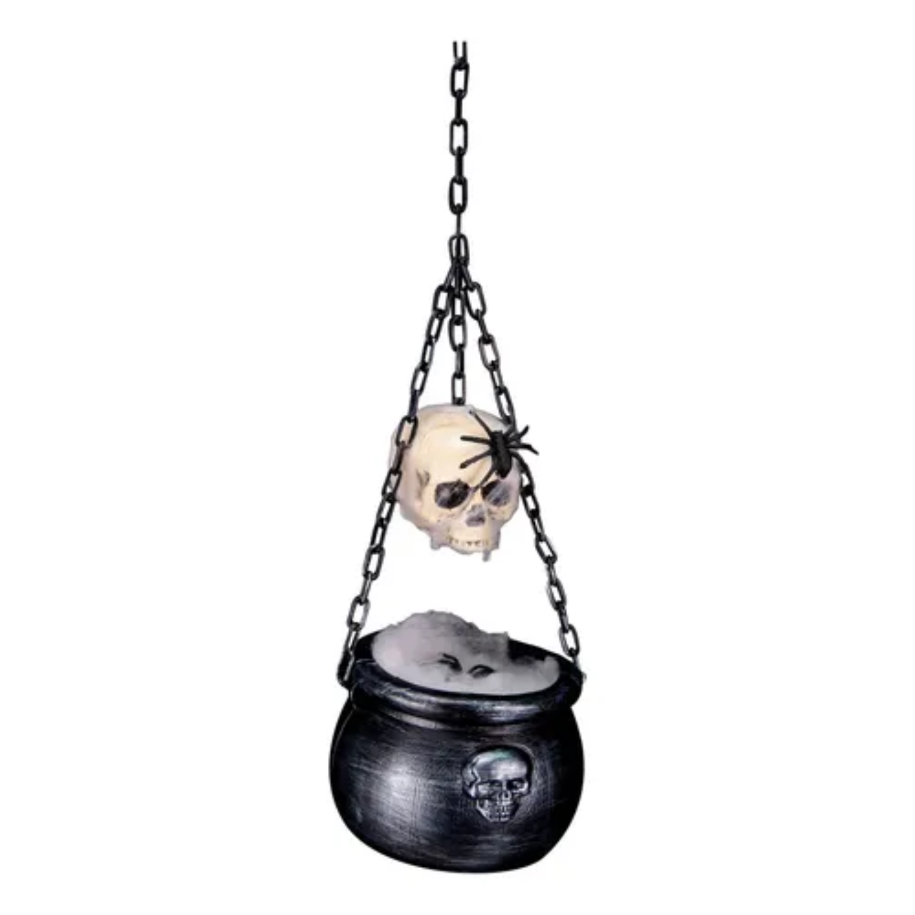 La caldera colgante con calavera para Halloween es un adorno temático que combina una caldera de aspecto antiguo con una calavera siniestra, diseñada para crear un ambiente espeluznante y atractivo en fiestas o decoraciones de temporada. Está fabricada en materiales ligeros y resistentes, fácil de colgar en interiores o exteriores, y resulta ideal para reforzar la atmósfera de misterio y terror propia de la celebración de Halloween.